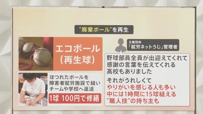 ほつれたボールを障害者就労施設で縫って、チームや学校へ返送する取り組みです。1球100円で修繕をしてくれて、高校野球部など全国416団体から依頼があり、年間3万球を修繕しているということです。