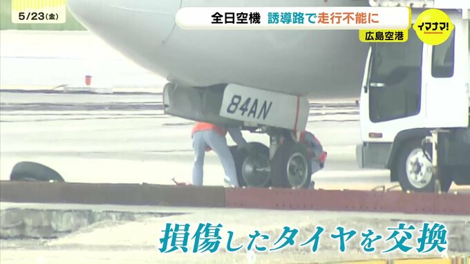 22日夜、広島県三原市の広島空港で、全日空機が着陸後に走行不能となった事故。乗客などにけがはありませんでした。一夜明けた23日も朝から機体は誘導路に停止したままです。走行不能になって17時間以上経った同日午後、損傷したタイヤが交換されました。