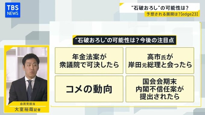 特に内閣不信任案の提出については国会会期末の重要な局面となる可能性がある。野党がまとまり提出すれば可決する状況であり、その場合、内閣総辞職か解散のいずれかを選択することになる。ある党幹部は「森山幹事長は不信任案が出たら解散説。どっちにしろどん詰まりな状況になるから」と語る。