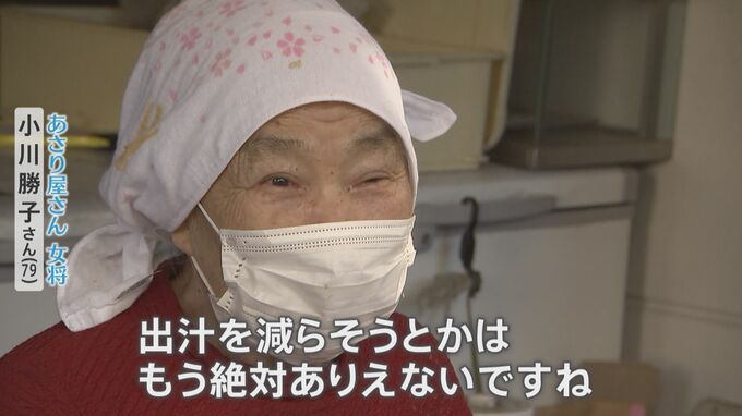 もう1つ、この人気の理由が看板女将の勝子さん(79)の人柄。原料費の高騰で経営が大変な中、お客さんの笑顔のため名物あさりご飯、550円。値上げはしたくないと頑張っています。