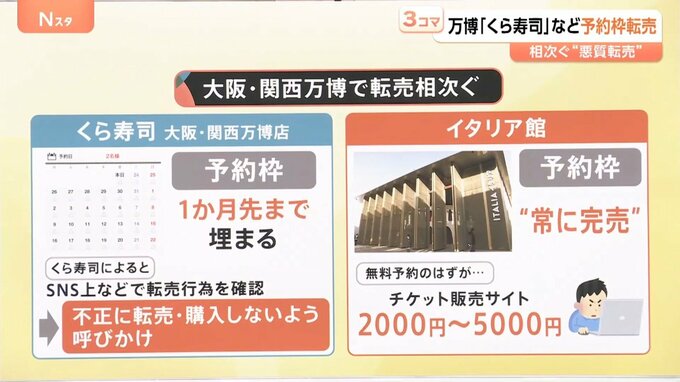 予約は無料のはずが、チケット販売サイトでは2000円~5000円程度の価格で予約枠が売られており、大阪市としても、「法的措置なども検討して厳しい対応をしていきたい」としています。
