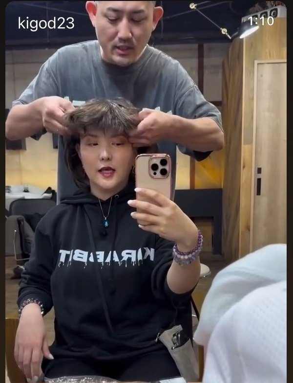 美容室について寛ぐ希良梨さんは、美容師の方と語り合いながら、おもむろにキャップを、そしてその下にかぶっていたロングヘアのウィッグを取ってしまいます。続いて、美容師の方が希良梨さんにかぶせたのは、ショートヘアのウィッグ。