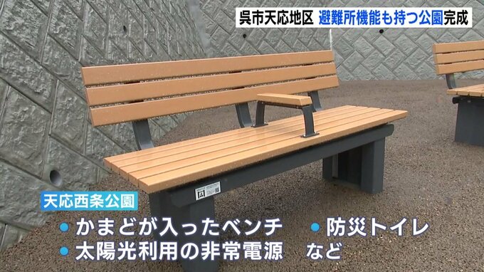 砂防ダムの整備により以前の公園の代わりに呉市が再整備しました。一時避難場所の役割を持つ公園には、かまどが入ったベンチや防災トイレ、太陽光を利用した非常電源などが備えられています。