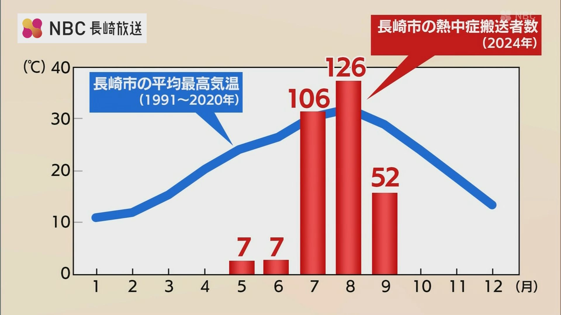 長崎市の最高気温の平年値を示したグラフです。7月から8月にかけて気温がぐっと上がり、それに比例するように熱中症で搬送される人の数が急増します。