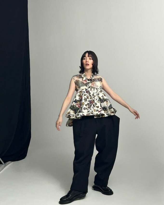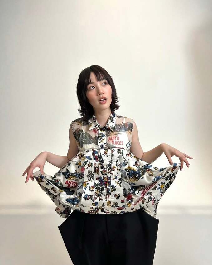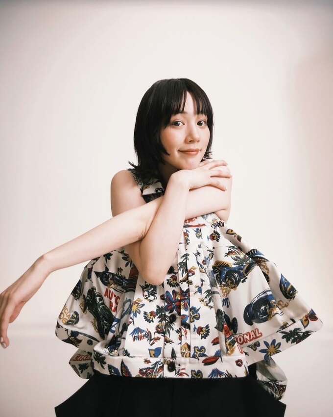 投稿された画像では、のんさんが自動車や花のデザインが鮮やかに施されたノースリーブトップスを身にまとい、個性的なファッションセンスを披露しています。色鮮やかなトップスに合わせて、黒いワイドパンツと黒い靴という対比的なコーディネートとなっています。