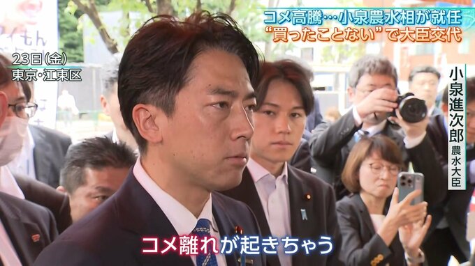 自称「コメ担当大臣」こと、小泉氏。就任早々、現場に足を運びカメラの前で値下げに向けた決意をアピール。