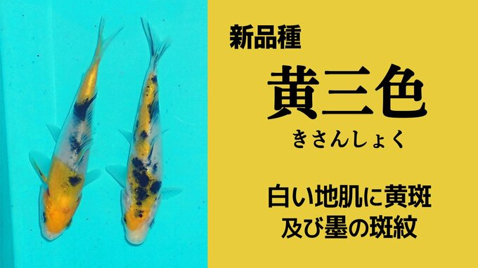 新品種は、「黄白」に「大正三色」を交配し、白い地肌に黄斑及び墨の斑紋がある「黄三色」(きさんしょく)と、