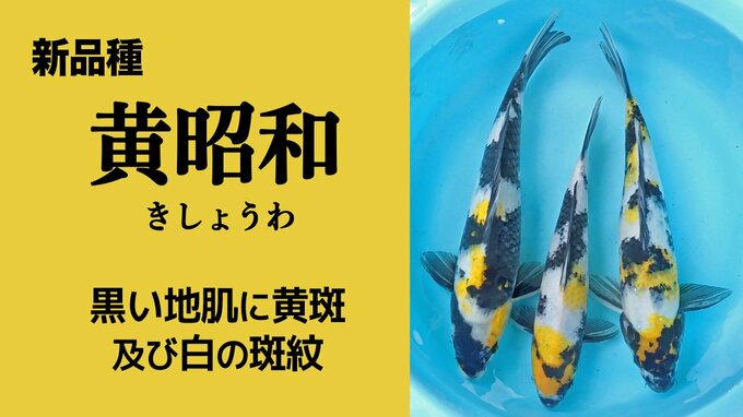 「黄白」に「昭和三色」を交配し、黒い地肌に黄斑及び白の斑紋を載せた「黄昭和」(きしょうわ)の2種類です。