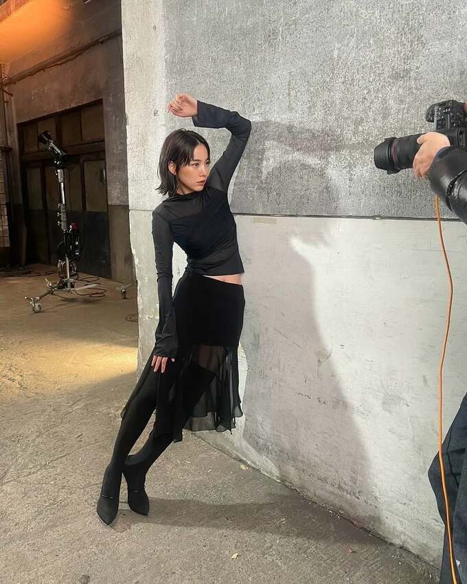 別の写真からは、実際の撮影現場の様子も伝わってきます。コンクリートの壁にもたれかかりながらポーズをとるのんさんと、それを撮影するカメラマンの手元が写っており、この写真はスタイリストさんが撮ったことを明かしています。