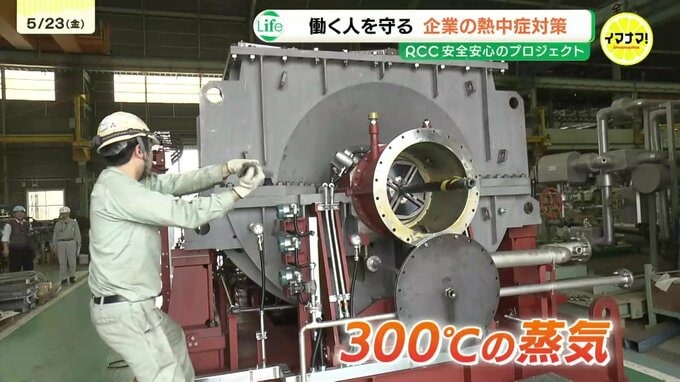 300度の蒸気で高温作業となる生産ラインもあるそうです。実際に、現場で働く男性作業員は、「溶接の作業は、溶接からの熱気も相まって暑い」と話します。溶接作業では安全上、長袖の作業服や手袋が必要でファンのついた作業服は着用できないそうです。