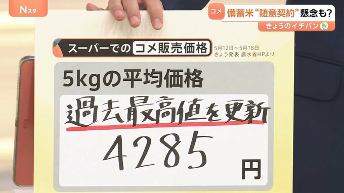 コメのスーパー販売平均価格は、この1年で倍以上となり、5月5日~11日の販売平均価格は5キロ=4268円となっていました。また、新たに入ってきた5月12日~18日のスーパーでのコメ販売価格は、過去最高値を更新し、5キロ=4285円となりました。