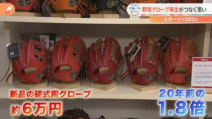 現在、新品の硬式用グローブの価格はなんとおよそ6万円。材料費や職人の人件費の高騰により20年前の1.8倍もするんです。