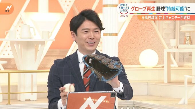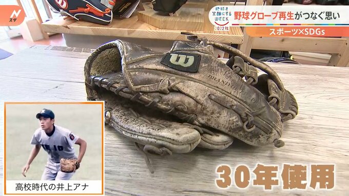 井上キャスターが、およそ30年使用しているグローブもリメイクして頂くことに。