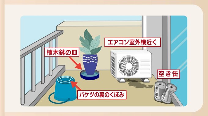 2ミリから3ミリの深さがあれば産卵場所になるため、蚊の発生源となる水たまりをなくすことが、蚊に刺されない対策の第一歩!