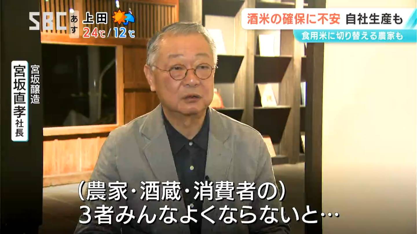 宮坂醸造 宮坂直孝社長:「長野県の酒の評価が高まってきているところで今まで積み上げてきたブランド力がご破算になってしまうので、我々にとっては死活問題です。(コメ農家と酒蔵は)もう全く運命共同体なんです。農家の方々も豊かになり、そのコメを安定的に頂戴して私どもは安定的に商売できる。そしていい酒を造って長野県酒をうまいなぁと言って喜んで飲んでもらう。農家・酒蔵・消費者=3者みんなよくならないと」