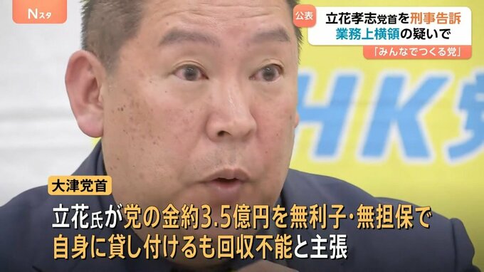 「みんなでつくる党」の前身は、立花氏が設立した当時の「NHKから国民を守る党」ですが、大津党首は立花氏が党の金、およそ3億5000万円を無利子・無担保で自身に貸し付け、この金が回収できないと主張しています。