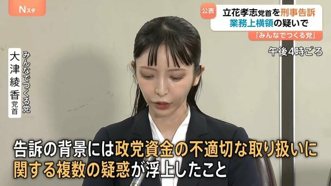 「みんなでつくる党」の大津綾香党首は午後4時ごろ、政治団体「NHKから国民を守る党」の立花党首について、業務上横領の疑いで警視庁に刑事告訴し、受理されたと明らかにしました。