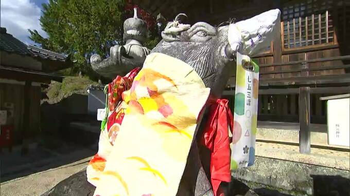 七五三参りの季節です。岡山県和気町の和気神社では、境内にあるイノシシの像がこの時期ならではの姿で参拝客を出迎えています。 (杉澤眞優キャスター)「和町神社では狛犬ならぬ、狛イノシシが色鮮やかな着物を…