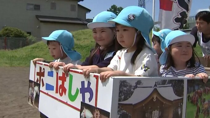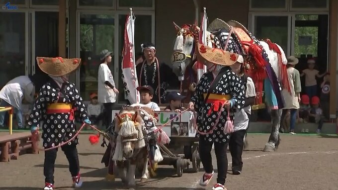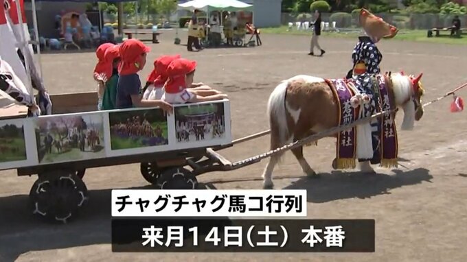 6月14日に行われる初夏の風物詩「チャグチャグ馬コ」を前に、装束姿の馬コが岩手県滝沢市内の保育園を訪れ、子どもたちと触れ合いました。