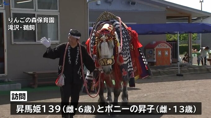28日、滝沢市のりんごの森保育園を訪れたのは華やかな装束を身に着けた6歳の「昇馬姫(しょうまひめ)139」と、13歳のポニー「昇子(しょうこ)」の雌の2頭です。