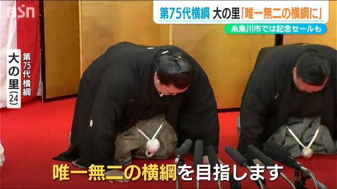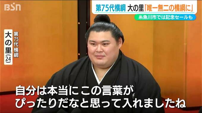 2場所連続優勝を果たした県立海洋高校出身の大の里の横綱昇進が正式に決まりました。相撲留学で中学、高校の6年間を過ごした糸魚川市のスーパーでは早くも新横綱誕生を祝って記念セールも始まっています。