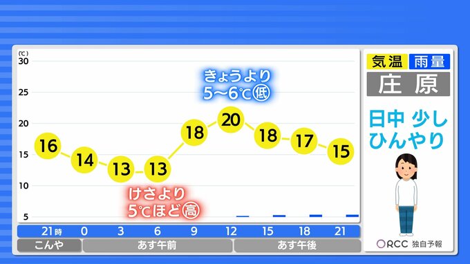朝の気温は、沿岸部できょうよりやや高く、北部や内陸部では5℃前後高くなり冷え込みは緩むでしょう。ただ日中はあまり気温が上がらず、各地5℃前後きょうよりも低くなる見込みです。20℃前後の地点が多く、湿度が高めでジメッとした体感になりそうです。日差しが届きにくいので、肌寒い体感の時間もあるでしょう。あすは長袖の方が良さそうです。