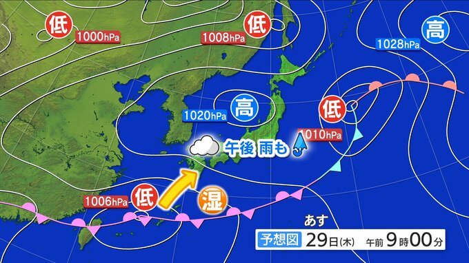29日(木)すっきりしない空模様 午後ほど雨が降りやすい 日中は肌寒い体感の時間も
