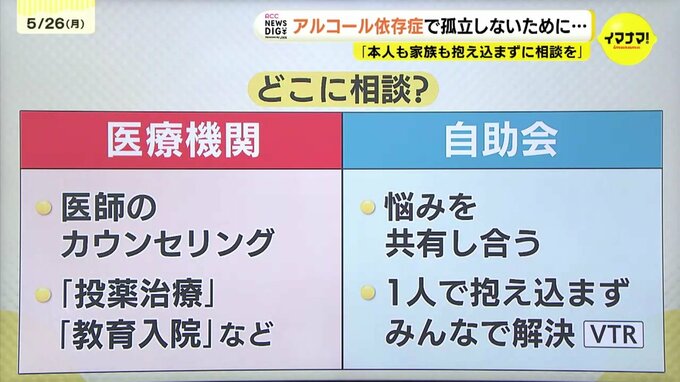 夫がアルコール依存症で精神科に入院したことをきっかけに自助会に入会したという女性は「全然お酒をやめられなかったのが、自助会に入ってからやめ続けてくれている。ここに来たら、みんなが同じことを深く話さなくても気持ちを分かってくださる」と話していました。