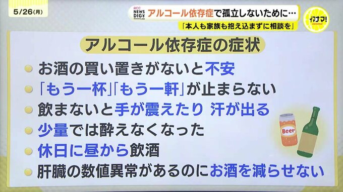 医療機関による治療は症状が軽いうちに始める方が良いということで、この機会に飲酒習慣を見直し、正しいお酒との付き合い方を見つけていくことが大切です。