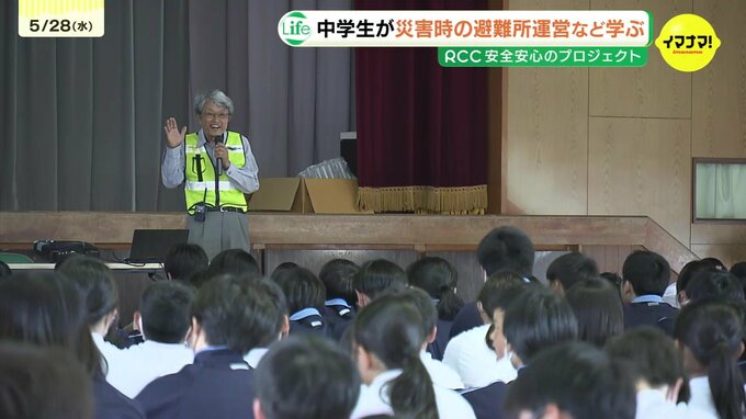 梅雨時期を前に、災害が起きた時の避難所運営などについて学んでもらおうと、28日、広島市内の中学校で防災講座が開かれました。