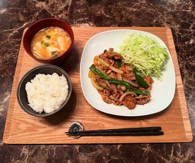 椎名桔平さんは「#生姜焼き」と、書き出し、「今夜は野菜切って肉焼いての定食」と、手料理の写真を投稿しました。写真には、豚肉に玉ねぎ、緑のピーマンで彩られた生姜焼きにキャベツが添えられ、ご飯と豆腐が入った具だくさんのお味噌汁が並べられています。
