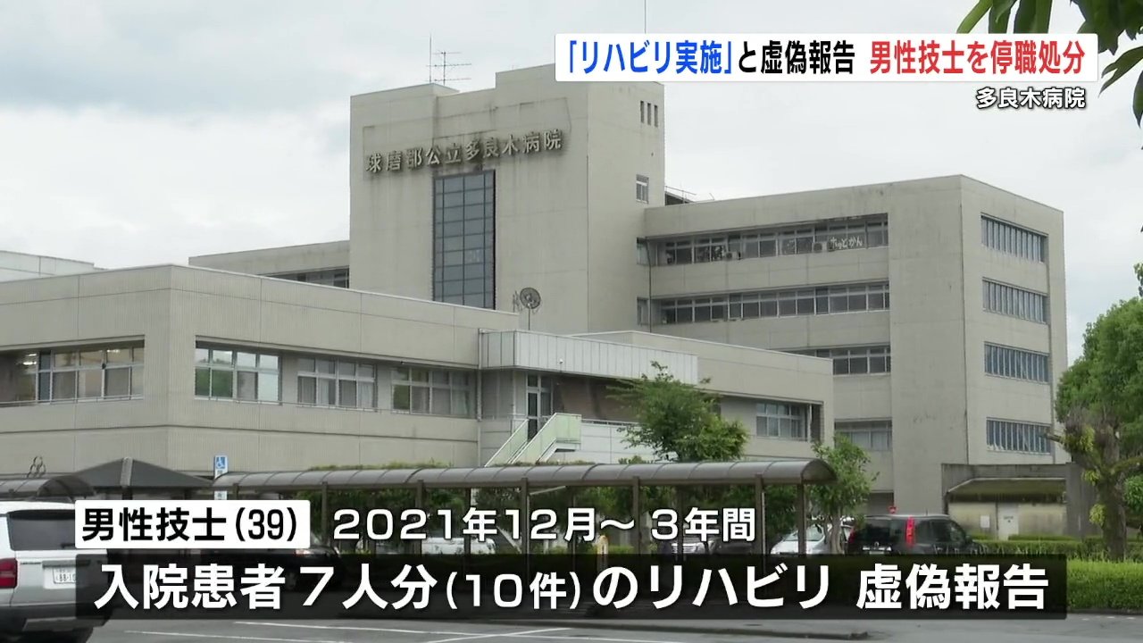 公立多良木病院は、実施していないリハビリを「実施した」と嘘の報告した男性技士を停職処分としました。男性技師は依願退職しています。