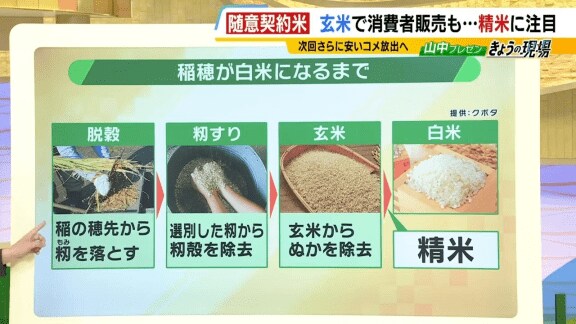 まず、お米の基本工程から見ていきましょう。収穫された稲穂から籾(もみ)を取り出す作業が「脱穀」です。米はこの時点ではまだ硬い籾殻に包まれています。次に籾殻を取り除く作業が「籾摺り(もみすり)」です。籾殻が取り除かれた状態のお米が、いわゆる「玄米」となり、玄米から周りの層「ぬか」を取り除く作業が「精米」であり、この工程を経てようやく「白米」になるのです。