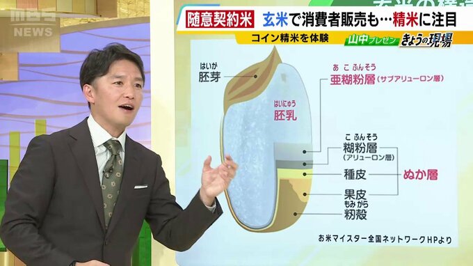 私たちがふだん食べているのは、お米の中心部にある「胚乳(はいにゅう)」白い部分です。玄米の状態では、胚乳の周りが何層も複雑に覆われています。
