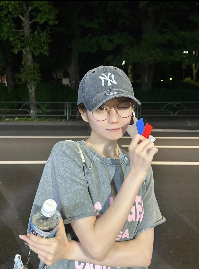 「すっぴんオフモードです!」という大谷さんは、ニューヨーク・ヤンキースのデニムキャップにグレーのオーバーサイズ目の厚手Tシャツを合わせ、食券を片手にメガネでウィンク。オフモードでも目を惹くアイドルらしいルックスを披露しています。