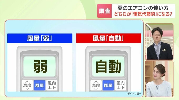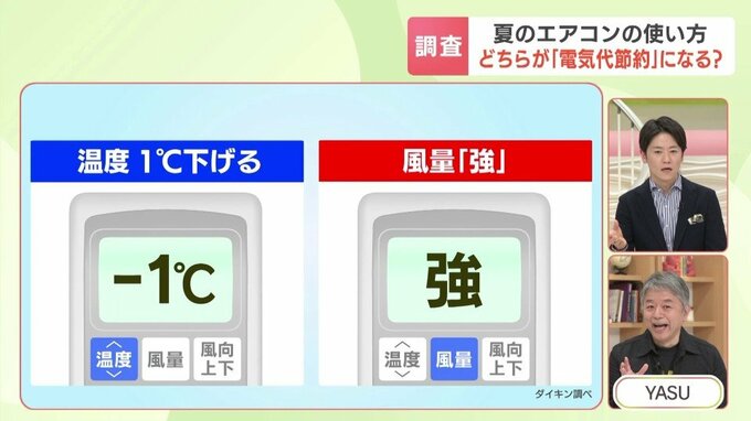 「強」にした場合は、設定温度を「1度下げた」時に比べ、消費電力量がおよそ半分になったということです。