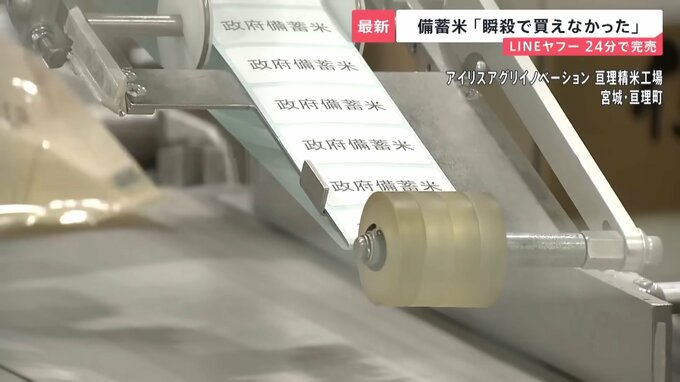 「政府備蓄米」と書かれたシール。その手前を流れるのは米が詰まった袋。シールが貼られ、ダンボールに詰められていきます。