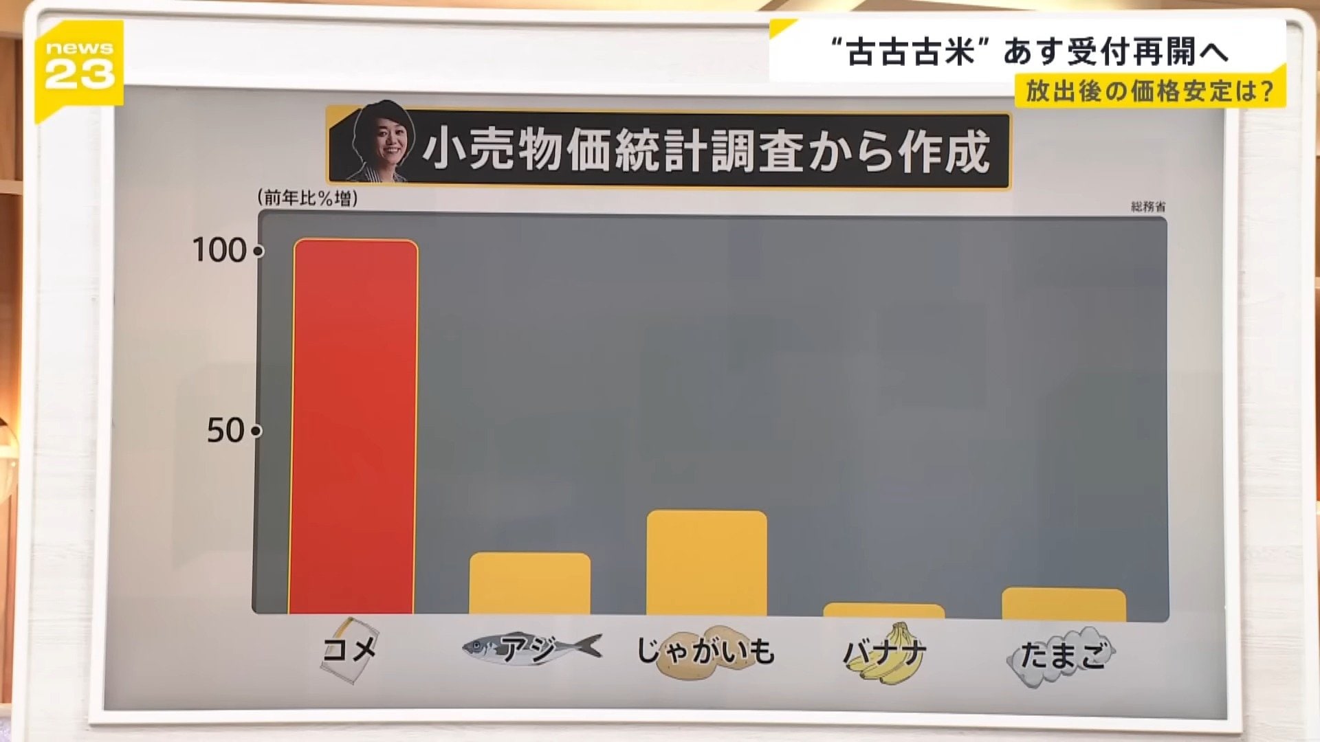しかし、2024年5月と2025年度の5月を比較して、どれぐらい価格が上がっているかを見る「小売物価統計調査」(総務省)のグラフを見ると、ほかの生鮮食品に比べると、コメの価格の上がり方が、2倍ぐらいになっている。