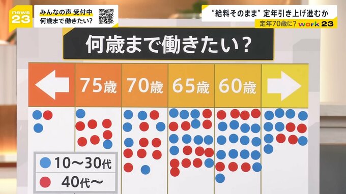 何歳まで働きたいか、街で80人に聞いた結果がこちらです。10代~30代は青、40代以上は赤いシールを貼ってもらいました。