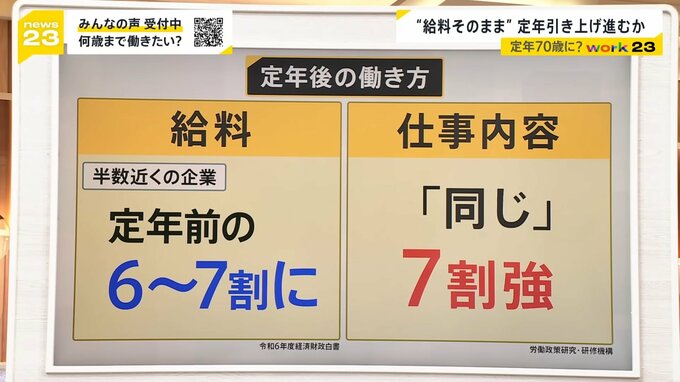 そして、もうひとつ重要なのが給料だと思います。定年後の働き方として、令和6年度経済財政白書によると、半数近くの企業が定年前の6~7割に給料は下がるといいます。ただ、労働政策研究・研修機構によると、仕事内容は「同じ」という会社が7割強となっており、同じ仕事でも給料は下がってしまいます。