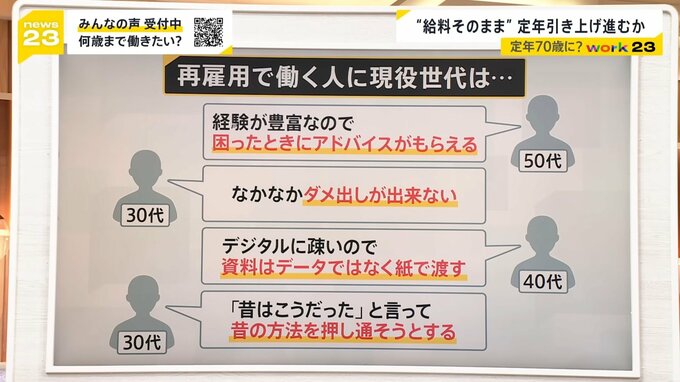 逆に若い世代に駄目出しできないという人もいるので、世代をくくって答えるのがすごく難しいなと思います。ただ仕組みの面で、定年の延長と年功序列制度がセットになると、若い世代からすると、「上のポストが空かない」という感覚にはなりますよね。