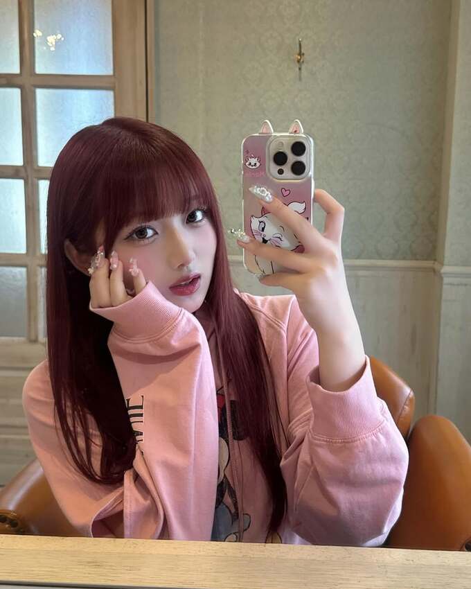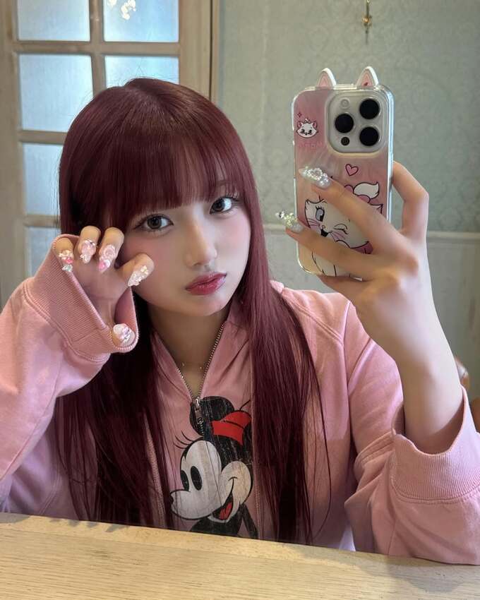 さらに、自撮りに使用しているスマートフォンのケースもディズニーのキャラクター・マリーのピンク色のケース。ネイルもピンクを基調とした凝ったデザインになっています。