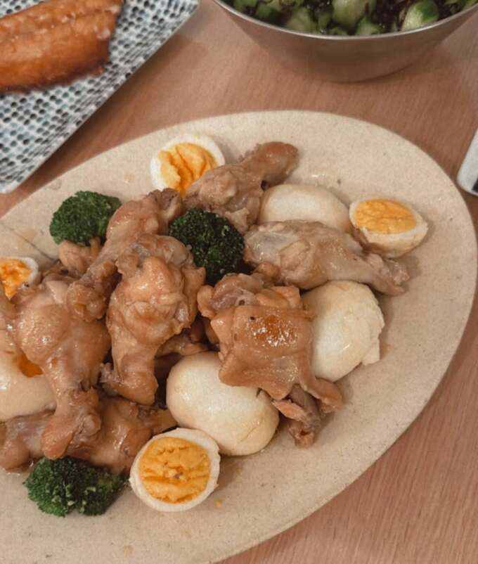 投稿された写真には、柔らかく煮込まれた骨付きチキンにゆで卵とブロッコリーが添えられた料理が確認でき、限られた時間の中でも彩りを意識した盛り付けが特徴的です。