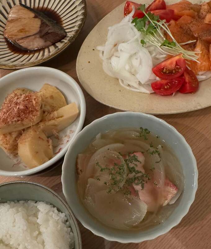 こちらの写真では、タマネギとトマト、カイワレを使った色とりどりのサラダや、タマネギとベーコンのスープ、たけのこの煮物、煮魚など、バラエティ豊かな料理が並んでいます。