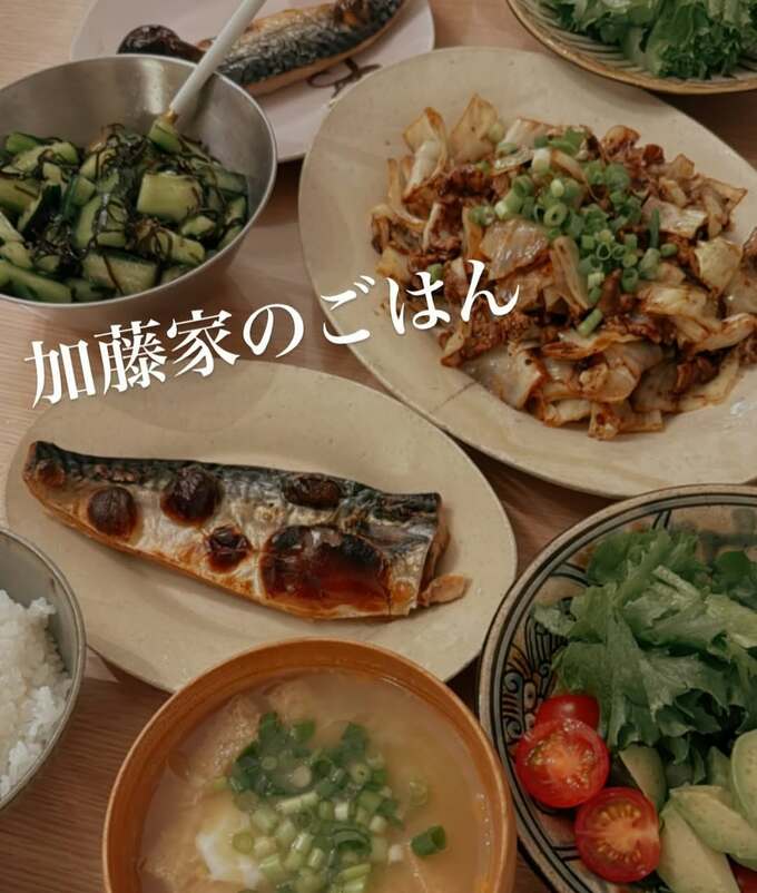 他にも、「加藤家のごはん」と題された投稿では、焼き魚やキャベツの炒め物、新鮮なサラダに味噌汁と白いご飯。