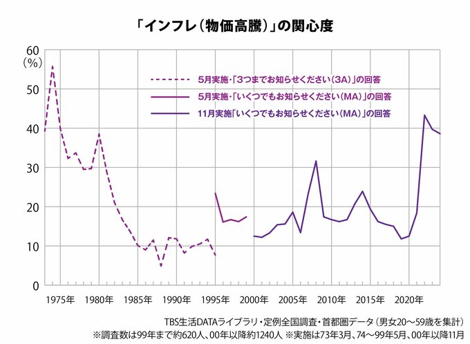 その後、80年代前半に物価高が落ち着いていくとともに、3Aでの「インフレ(物価高騰)」関心度も急激に下がり、80年代後半は1割程度で安定。3A最後の95年は関心度8%で、これは、当時30個あった「社会全般の関心事」選択肢でのランキングでいうと15位。
