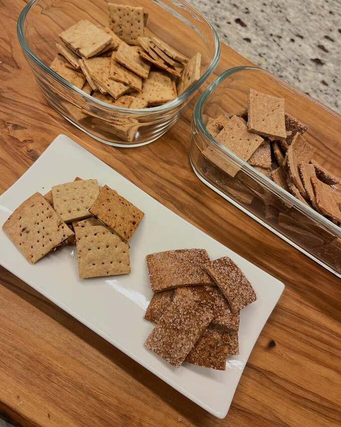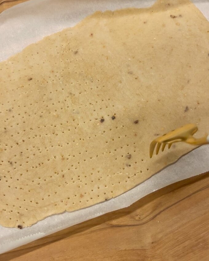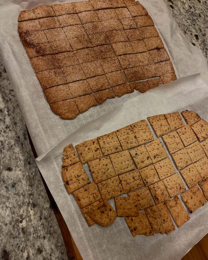 続けて、「レーズンも入れるのをやめて、お出汁のクラッカーとシナモンシュガークラッカー!どちらもほんとにおいしい!サクサクです!使う粉によって水分量が異なるので、工夫してみてください!」