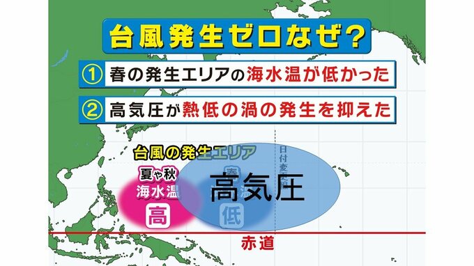 「台風はご存知の通り、海水温が高いエリアで発生しますので、海水温が低いとなると発生が抑えられる」というのが1つ目の理由です。