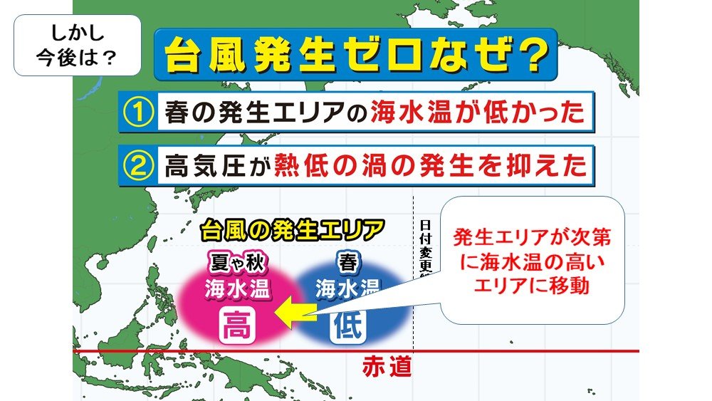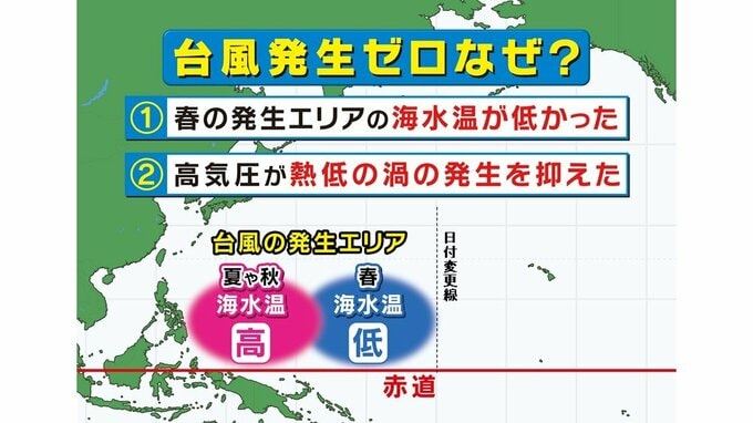 さらに「4月5月に台風が発生するエリアに高気圧があって、これが頑張っていた」と2つ目の理由を説明します。