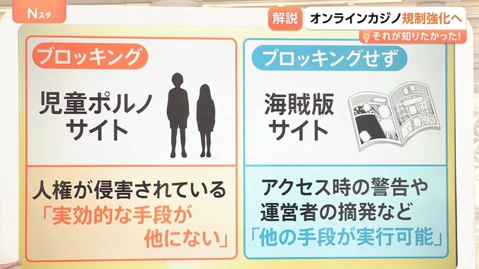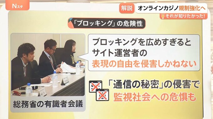 現在行われている総務省の有識者会議では「ブロッキングを広めすぎると、サイト運営者の表現の自由を侵害しかねない」「オンラインカジノに対してブロッキングを認めると、他もブロッキングする連鎖が起きるのではないか」といった意見があがりました。